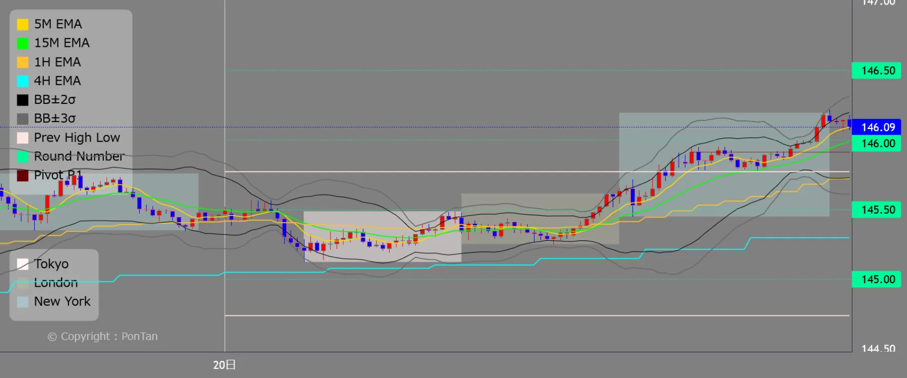 पोंटैन चार्ट 5 दिनों के लिए मूल्य में उतार-चढ़ाव दिखाता है, जिसमें जर्नल में दर्ज दिन भी शामिल है। केवल 15 मिनट का चार्ट प्रदर्शित होता है। आप माउस व्हील के साथ ज़ूम इन और आउट कर सकते हैं, और आप बाएं और दाएं स्क्रॉल करके पिछले मूल्य आंदोलनों की जांच कर सकते हैं। ऊर्ध्वाधर रेखा दिनांक परिवर्तन रेखा दिखाती है और हमेशा प्रदर्शित होती है, लेकिन आवर्धन के आधार पर, नीचे की तारीख को छोड़ा जा सकता है। जर्नल के दिन का चार्ट हर 15 मिनट में अपने आप अपडेट हो जाता है। जब तारीख बदलती है, तो केवल उस दिन की पत्रिका से संबंधित चार्ट बाद के अपडेट के अधीन होता है, और अन्य तारीखों के चार्ट तय हो जाते हैं। इसका उद्देश्य “उस दिन वास्तविक समय में देखे गए चार्ट का इतिहास रखना” है।